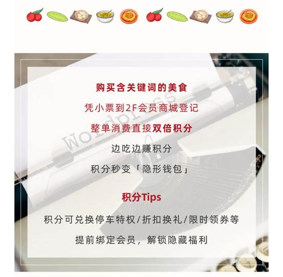 (1)解锁夏日限定菜单:杨梅冰沙、苦瓜柠檬茶、鸡丝凉面……凭小票到2F会员中心登记,消费直接双倍积分!