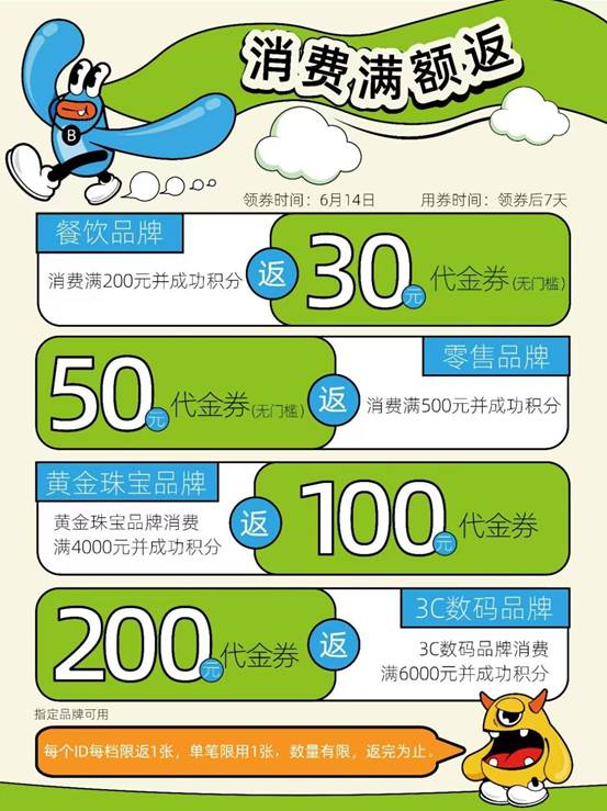 ★消费满额返券:餐饮满200元返30元,黄金珠宝满4000元返100元!